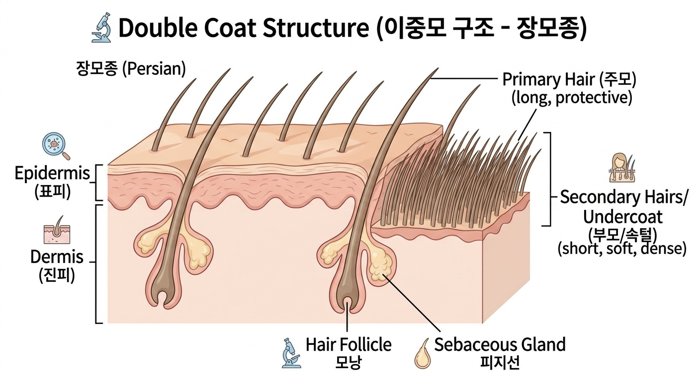 페르시안처럼 풍성하고 아름다운 털을 가진 장모종은 생물학적으로 이중모(Double Coat) 구조를 가집니다. 주모(Guard Hair)는 길고 굵으며, 외부의 충격이나 물기로부터 피부를 보호합니다. 그리고, 속털이라고 불리는 부모(Undercoat)는 주모 아래에 빽빽하게 자라는 아주 가늘고 부드러운 털로, 보온 역할을 합니다.