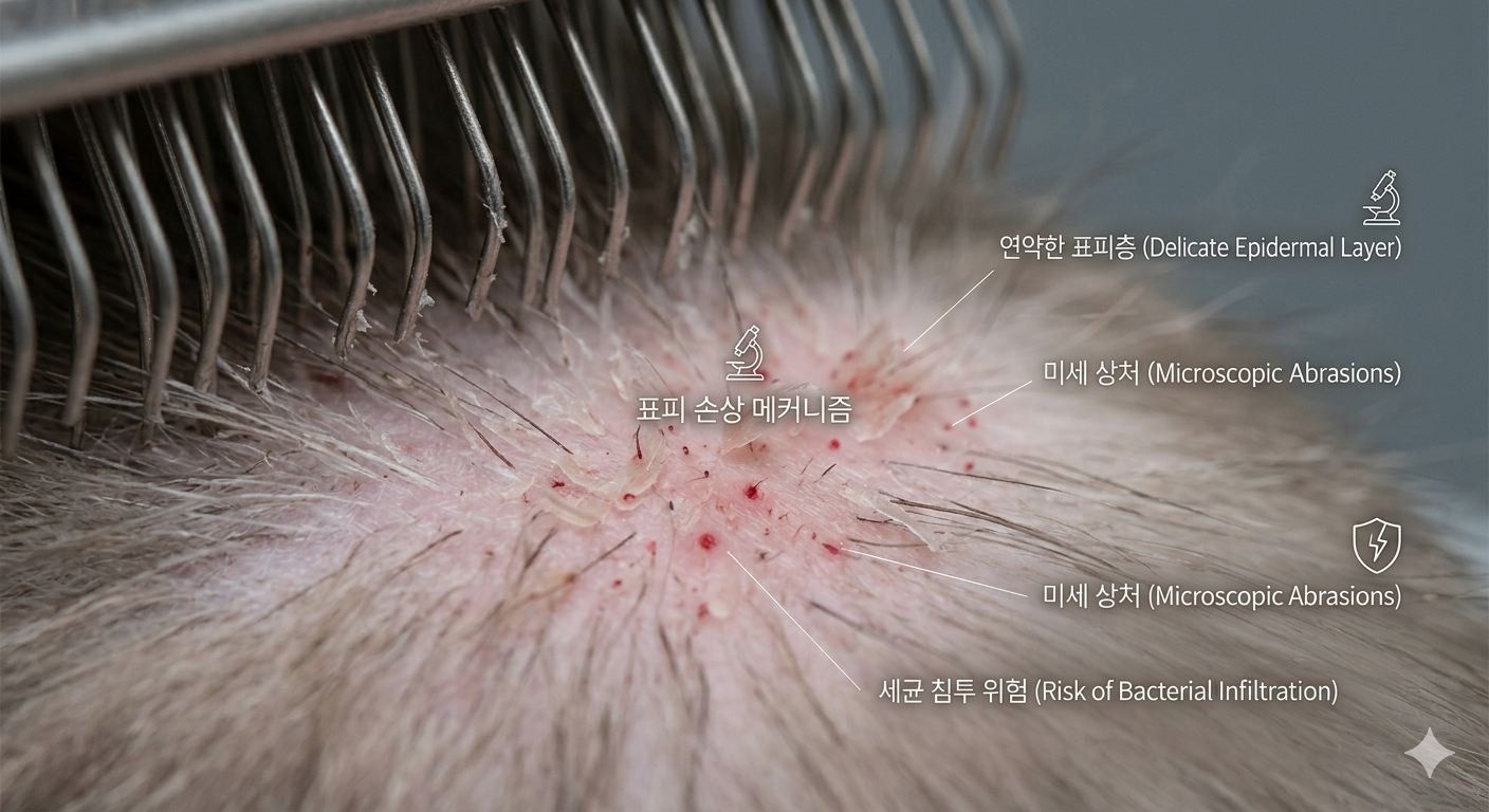 많은 집사님이 빗질할 때 "시원하게 빗겨줘야지"라는 마음으로 힘을 주어 박박 문지르곤 합니다. 하지만 이는 고양이 피부 구조를 전혀 고려하지 않은 치명적인 실수 입니다. 고양이의 표피는 사람보다 3배 이상 얇습니다. (이전 포스팅에 다뤘던 내용입니다.) 거친 빗으로 힘을 주어 문지르면, 우리 눈에는 보이지 않지만 연약한 표피층이 뜯겨 나가고 미세한 상처가 생깁니다. 이 상처를 통해 세균이나 진균이 침투하면 만성 피부염으로 이어질 수 있습니다. 빗질은 '털을 뽑는 것'이 아니라, '피부를 보호하는 것'이어야 합니다.