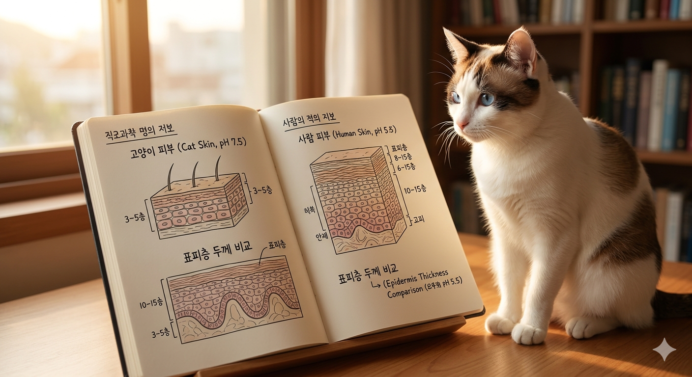 우리가 고양이 전용 제품을 쓰고, 조심스럽게 다뤄야 하는 이유는 감성적인 이유 때문이 아닙니다. 철저히 생체 생리학적 차이 때문이죠. 사람의 피부는 pH 4.5~5.5의 약산성을 띠어 세균 번식을 막습니다. 하지만 고양이는 pH 7.0~7.5의 중성 내지 약알칼리성입니다. 사람이 쓰는 '좋은 약산성 샴푸'를 고양이에게 쓰면 어떻게 될까요? 고양이의 천연 보호막(Acid Mantle)을 강제로 파괴하여 오히려 피부염과 가려움증을 유발하는 독이 됩니다.