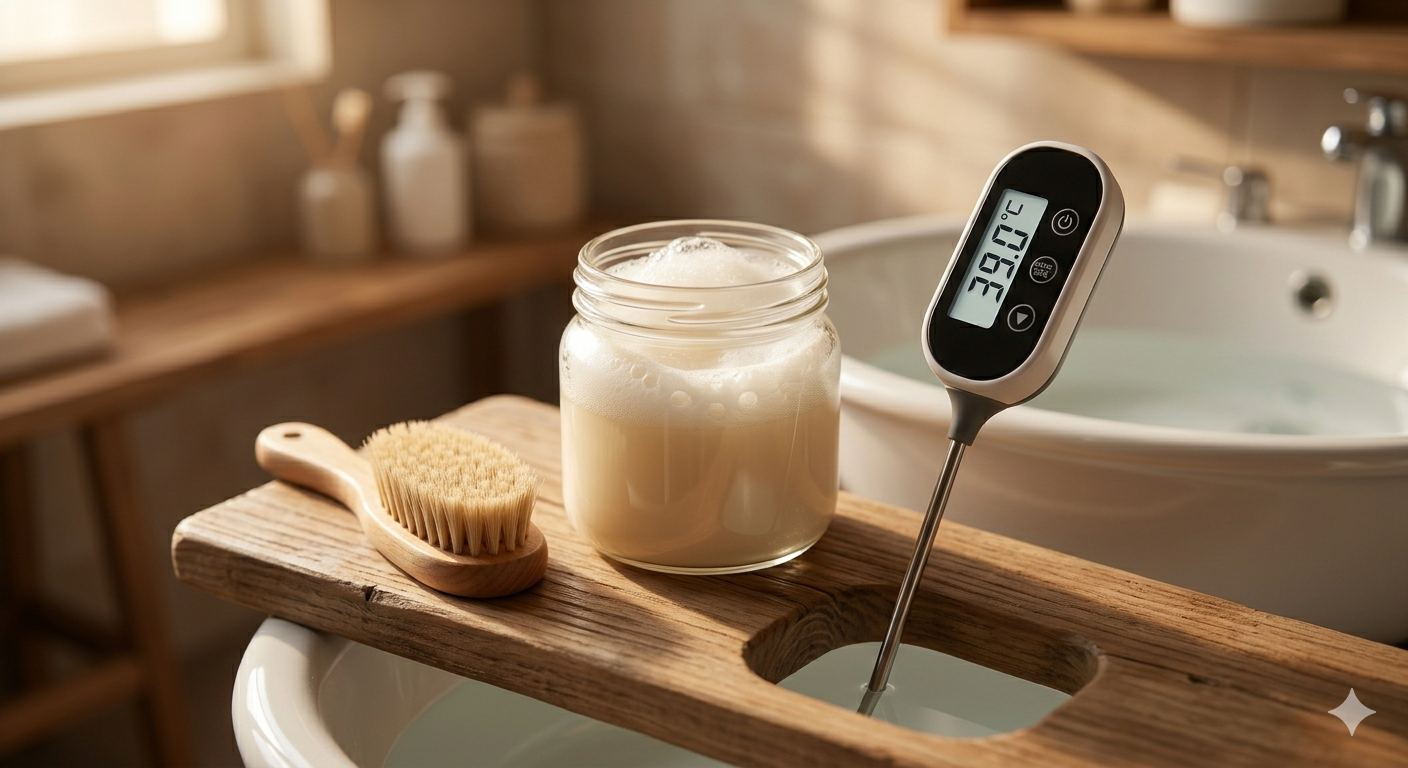 샴푸 원액을 피부에 바로 짜는 것은 얇은 표피에 과도한 삼투압 자극을 줍니다. 반드시 전용 용기에 물과 샴푸를 10:1로 섞어 풍성한 거품을 만드세요. 손가락 끝으로 겨드랑이, 사타구니 등 림프절 부위를 부드럽게 마사지하면 노폐물 배출이 원활해지고 아이도 안정감을 느낍니다.